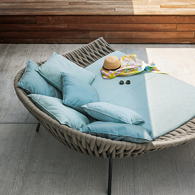 Cu spatarul coborat, sezlongurile Tosca de la Tribu par mai degraba niste foarte confortabile paturi lasate de cineva afara, intr-un moment de excentricitate. Saltelele largi si groase sunt puse in valoare de baza decorata cu fasii late dintr-un material outdoor inovator, in acelasi timp impermeabil si foarte moale, impletite manual. Senzatia de lux se transmite imediat si fara ocolisuri: stii de la prima privire ca Tosca este la alt nivel.
