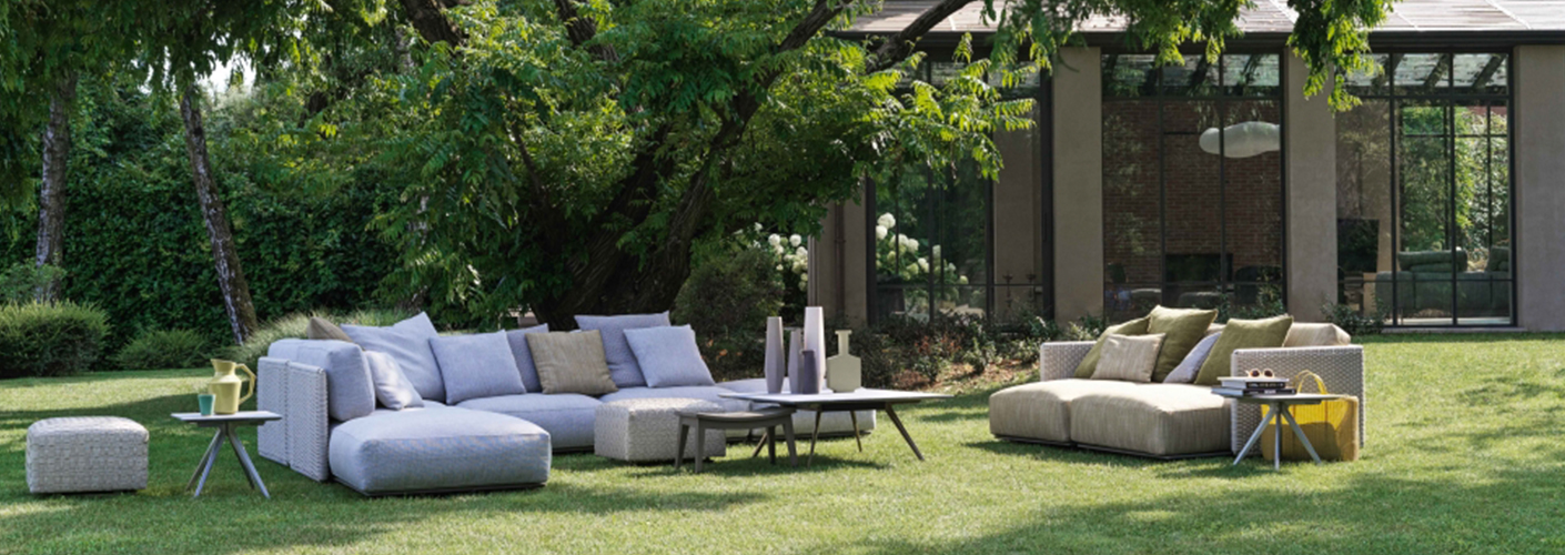 O poienita din parc gazduieste un living luxos, perfect pentru o intalnire neprevazuta cu prietenii, la un aperitiv. Canapeaua sectionala Eddy, cu proportiile sale generoase, iese in evidenta prin tesaturile in tonuri neutre, cu tuse bogate de bordo. Canapeaua este combinata cu o pereche de fotolii Peter Outdoor. Perfecta si pe post de masa de cafea, in centrul compozitiei se afla o foarte versatila maxi-otomana Bangkok Outdoor, intr-o nuanta adanca de bordo, care poate fi folosita si pentru a aseza mai multe persoane.