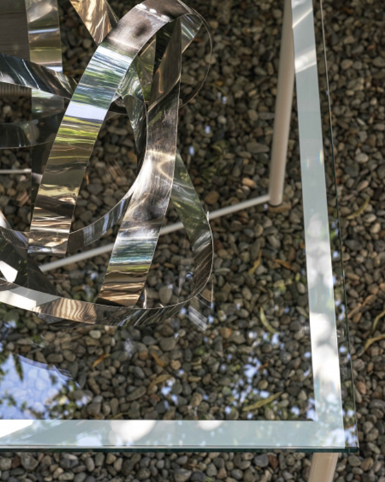 In spatiul adiacent serei, covorul Dakota de culoarea prunei delimiteaza un spatiu pentru luat masa in aer liber, mobilat cu o masa de dining Fly Outdoor si cu scaune Ortigia Outdoor, din lemn masiv de iroko, cu tapiterie in striatii alb-bordo. Detaliu al blatului din porfir al mesei. Dining in aer liber, sub glicine: masa si scaune Moka din otel lacuit alb. Detaliu al blatului din sticla.