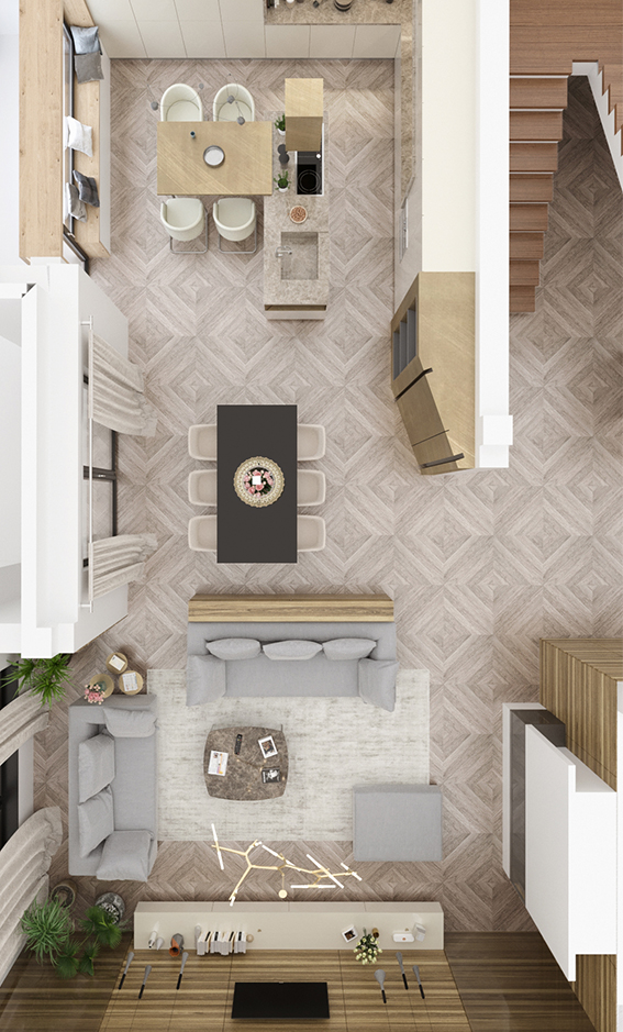 pot fi realizate randari. Acestea sunt simulari 3D foto-realiste, care permit vizualizarea spatiului in curs de proiectare, asa cum va arata el “in viitor”; in ciuda faptului ca pare o fotografie a unui interior deja amenajat, randarea este o imagine generata de computer, printr-un procedeu complex si care angajeaza resurse considerabile.